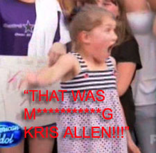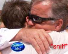 But we've talked enough about Lambert; last night's was Allen's and Allen's alone, and we hate to sound like one of those spotlight-rabid judges, but we're starting to believe he can actually take it all. He hasn't the flash of his opponent, but like a sexually come-of-age David Archuleta, there's something about his humble ascent here from small-town Arkansas boy to superstar that encapsulates the Idol ethos. Of the three, his hometown visit was by far the most emotionally affecting, and I'm both proud and ashamed to admit I actually choked back some Hasselhoffian tears when his father embraced him. Who of us doesn't seek that kind of validation from a parent? And how often does someone realize their dreams so publicly and spectacularly, albeit imprisoned inside the snow globe of artificiality that is the Idol star-making machinery? There's times you want to begrudge them the experience, and times you don't, and Kris was definitely in the latter camp.