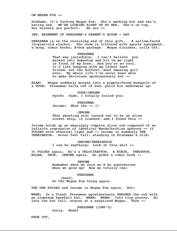 Though he's never worked with or met Megan Fox, he offers this One-Page Screenplay as a good faith jumping-off point.