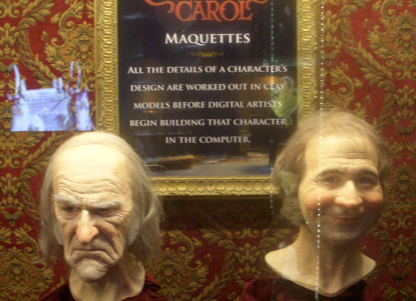 Upon exiting the exhibit, you're handed a pair of 3-D glasses and invited to enter an inflatable movie theater for a ten-minute preview that shows definite promise. Carrey is clearly having the time of his life, and the 3-D renderings of period London are fittingly spectacular. There's still the small 'dead eyes' matter, though, that it seems the technology has not quite yet overcome. As a result, the scene with Colin Firth's Fred Scrooge seemed cold and sterile, but a later sequence featuring Jacob Marley (one of three parts played by Gary Oldman) -- perhaps because he's dead-eyed to begin with -- came alive.