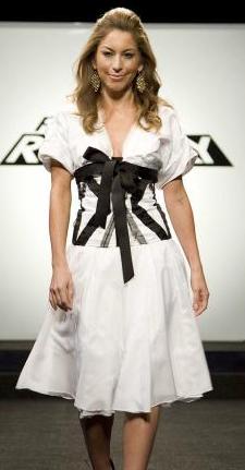 -Epperson's dress is gross -- a cheap white look with an overly stuff black-and-white bodice. It also uses very little of the original wedding dress, just as Epperson promised. Heidi throws her hands up and says, "I thought I made myself clear. You were supposed to work with the wedding dress. Your client, she didn't ask for an Oktoberfest moment. Or a pirate's wench. Or the death of decency."