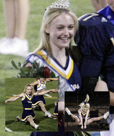 After ably performing a routine featuring a gluttonous menu of Extension Preps, Pencil Jumps, Spread Eagles, Double Hooks, Awesomes and Herkies, 15-year-old The Twilight Saga: New Moon star Dakota Fanning was crowned Homecoming Princess of North Hollywood's Campbell Hall Episcopal on Friday. We now have yet further evidence proving what we already knew: that there is literally nothing Dakota can't do. This should tide us over until she receives the Chopper of the Year Award from the Diamond Empire Radically Customized Motorcycle Club later this month.