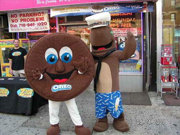 But perhaps the most important celebrity encounter of 2009 was when Carvel mascot Fudgie the Whale decided to make a truce with his rival, Mr. Oreos, in front of a Z100 kiosk and a 'No Parking? No Problem!' banner.