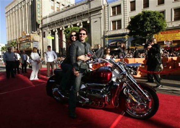 Tom Cruise and Katie Holmes on a motorcycle at the premiere of War of the Worlds