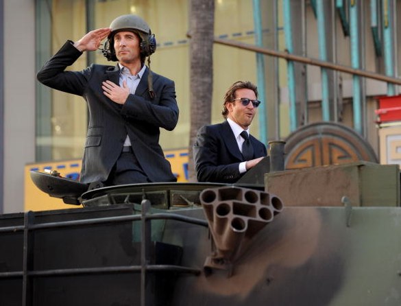 Bradley, Bradley, Bradley. The star of The Hangover may have wanted to butch up his image by arriving via tank with costar Sharlto Copley to the premiere of The A-Team last night. Still, what a missed opportunity! Men are already in the bag for this movie, B-Coop. If you really wanted to make an entrance -- and lured women in the process -- you would have pulled an old trick out of your hat and shown up naked a jaybird. (I guess Rampage Jackson must have vetoed the idea.)