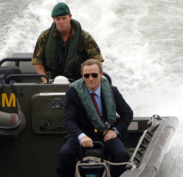 Daniel Craig arrives in a speedboat to the press launch of Casino Royale