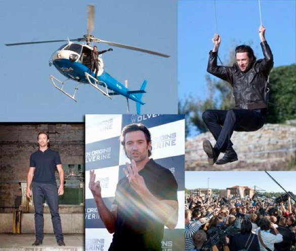 Hugh Jackman arrives via helicopter and zipline for the press tour of X-Men Origins: Wolverine