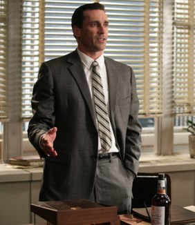 DON DRAPER enters from his work station in the bedroom, sleeves rolled up, lit cigarette tumbling from his lips. He checks his watch.