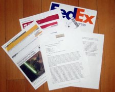 Enter the Lucasfilm legal team, I guess, which bundled some of the offending press along with a thorough order to the Hong Kong-based company to discontinue its "lightsaber" gimmick. Not ones to let an opportunity pass them by, that bundle -- including the FedEx envelope in which it arrived (and which occupied the same real estate as the man whose empire made this all possible! ZOMG! Or something) -- has landed on eBay, where it has welcomed 40 bids to date with a current high of $355.