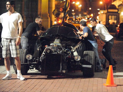 I didn't even know Brand's remake of the 1981 Dudley Moore comedy was shooting yet, or that Guzman was in it, but there you have it -- in all its WTF, gut-hanging glory. Let's salute Guzman for taking a chance as Brand's Boy Wonder, and let's also hope that the sighting of their shabby Batmobile (below) is the sign of a thunder-stealing genre spin to come. And, I suppose, that Greta Gerwig's table-waiting love interest isn't blown to shreds as part of the whole role-playing angle. That really would be too sad to bear. Anyway: Here are your pictures.