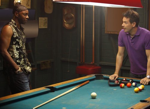 · Oh God, Tara and Franklin again! He's wearing, like, satin jammies? I mean, maybe that's all Talbot has in the guest room, but it's kind of a weird look. A tied-up Tara plays along and leans forward to kiss him, completing the odd tableau. I still don't buy the shift from savvy, one-step-ahead Franklin earlier in the season, but I guess Glee has prepared me for 180-degree character reversals at the drop of a hat. Tara gets him shirtless and then is goaded into biting him. OK, finally, a Tara/Franklin scene that's as scary and funny as I think they were intending them to be last week. (Sex: +5, Violence: +5)