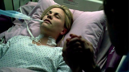 · All sorts of stuff is going down in the hospital! Sookie violently resists a blood transfusion, and now she's in a coma. She has a vision where her hair and makeup is just exquisite, then she walks down the hospital dream-corridor like Christina Ricci in that one Moby video. Somehow, Sookie imagines that she's visiting a 1960s commune, or possible a mental hospital's recreation area full of really attractive, occasionally topless patients. (Sex: +5) They scoop water light from Lost and dance a lot and I think we're all pretty embarrassed. Not, Sookie, though. She is excited to learn the answer to her identity mystery: She has the blood of Jennifer Beals in Flashdance! Dance, Sookie, dance!