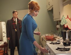 We'll probably never know, because this whole arc is building to the broader issue of Joan losing her legendary control. Can't a girl offer fried chicken to her boss ("A breast? A thigh?") without failing to coax a few days of babymaking time off after New Year's? Can't she make alternative arrangements with Greg without a hair-raising (and voice-raising, in what might be a first for Joan) reminder that he's going to Vietnam? Can't she stage a luau-themed party for him without slicing her hand open attempting to make orange juice? Can't she receive stitches from him -- in perhaps the most tender exchange we've ever seen between them -- without crying to the punchline of his jokes? And can't she receive Lane's dozen make-up roses without their accompanying message being switched with one intended for his estranged wife in London? (At least she did fire the offending secretary; take your wins where you can get them.)