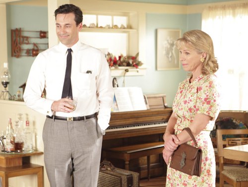 But that's the way the season's going, folks. Forget the ad trade, forget the sexual tension, forget the family dynamics, forget the chance that someone like Harry Crane might drop by for more than a few lines to establish other characters' angst and pathologies, forget that the only reason Don interested us at all in the first place is the compounding of lives in the city, in the suburbs, in the future, in the past. Forget the gradual expansion of characters over weeks and months of smoldering arcs (where was Bethany from the season premiere? What happened to her and Don's New Year's date?). Forget vaguely realistic motivations and conflicts; aside from Lane's flower orders getting mixed up and the Joan meltdown that ensues, nothing here has anything to do with the heightened, mildly surreal office politics that have helped sustain Mad Men luster three seasons. Is this progress?