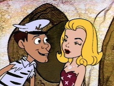 Bewitched's Darrin and Samantha (credited without Bedrock-friendly new names, shamefully) ham it up on the small screen. Point of order: Elizabeth Montgomery does not have small eyes, and I don't understand her caricature. Dick York looks accurately bamboozled and bug-eyed, though.