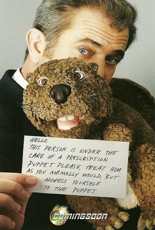 So, the teaser poster from AFM for The Beaver emerged and...suddenly the room is filled with elephants. Of course there's Mel Gibson himself, and then the fact that he's hiding his face behind a stuffed beaver. And yes, it is a bit topical and ironic that the note on the poster portrays him as mentally unstable. Really though, I actually think the poster for Jodie Foster's directorial effort is pretty effective as far as Mel Gibson/stuffed animal movies go. But check it out for yourself, and feel free to submit taglines.