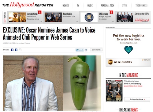 It's Friday folks, and that means this: "EXCLUSIVE: Oscar Nominee James Caan to Voice Animated Chili Pepper in Web Series." Oh, really, Internet? But is this bit of exclusive news real, or just some end-of-week comedy shenanigans from The Onion. Click ahead for your answer.