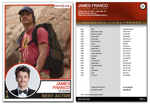It's time once again to return to Movieline's recently undertaken mission to honor this year's acting and directing nominees with a tribute that will surely outlive any trophy they could ever hope to receive: one of our inaugural Awards-Season Trading Cards. Today, let's give it up for Best Actor nominee (and Oscar co-host) James Franco!