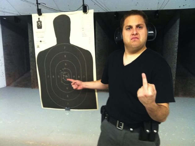 Let's hear it for Jonah Hill! The newly thin comedy star has taken to his official Twitter account like a duck to water -- or like an impostor to Twitter, as the case may sometimes be -- offering fans a peek behind the curtain at the making of 21 Jump Street. On Tuesday's docket: The firing range. "Let's shoot some bad guys, motherf***er!" Hill wrote. Click ahead to see the slightly NSFW picture of Hill, post-bad guys-shooting. (This is assuming that flipping someone the bird is not suitable for your office.)