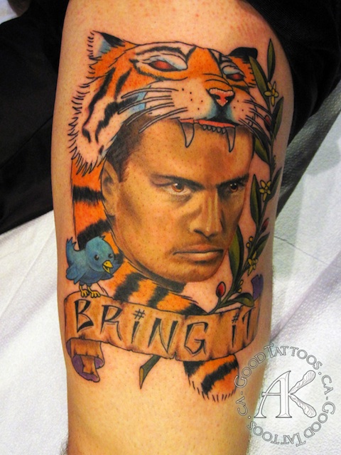 My only quibble with Canadian tattoo artist Andrew Ottenhof's tattoo of Charlie Sheen wearing a tiger head: Charlie looks a little more like his brother Emilio. Or Emilio's friend Ally Sheedy. Or Jean-Claude Van Damme. In a bad mood. In the '80s. Otherwise? Tragnifique!