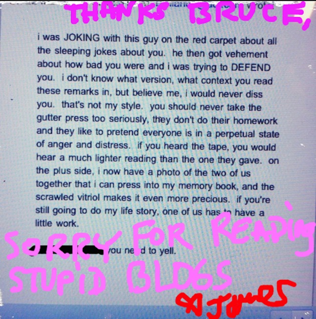 James Franco is still a little touchy about his critically-panned performance at this year's Academy Awards as evidenced by the way he reacted to Bruce Vilanch's unkind review on Monday. Correctly recognizing the seriousness of a snarky, scrawled Skitch Twitpic, Vilanch sweat through whichever novelty t-shirt he was wearing at the time and quickly extended an olive branch to Franco, which was speedily accepted by the actor. Take a look for yourself below.