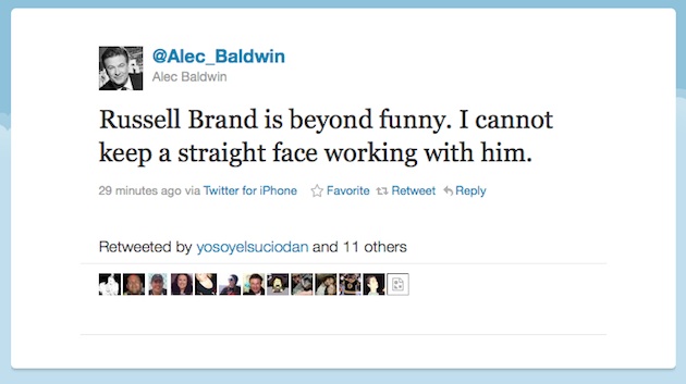 Judging from the way Baldwin's wig looked in that picture director Adam Shankman sent out earlier in the week, here's guessing Brand has a hard time keeping a straight face as well.