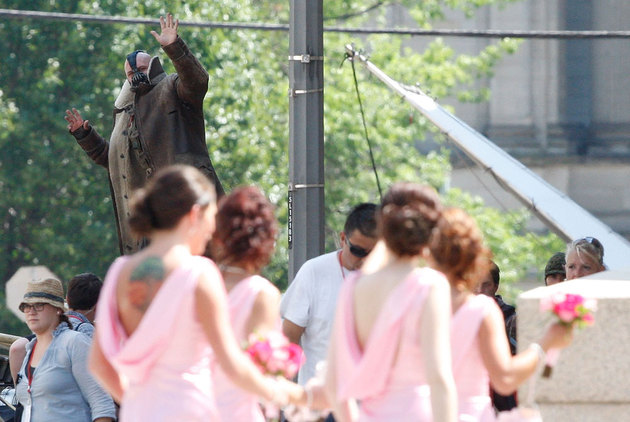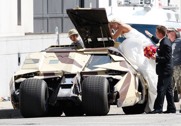 That latter image is among the many featured over the weekend in a very revealing batch of photos from the Dark Knight Rises set. Bale mixes it up with Tom Hardy as the archvillain Bane, who, in a moment of neighborly kindness and/or quintessentially Hardyesque quirk, threw up a wave at bridesmaids crossing the street near Carnegie Mellon University. Not too far away, a pair of newlyweds got to check the Batmobile -- decked out in desert camouflage that wasn't doing much to conceal it against the urban backdrop and sweltering Pittsburgh sun. And the, er, fake snow falling around our hero.