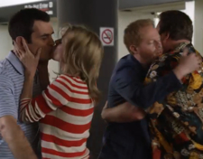 In advance of their winning the Emmy for Best Comedy tonight (please God), E!Online has learned that the gay kiss that so many have been agitating for has finally been shot and is in the can. So to speak.