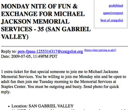 If you entered the online lottery to win tickets to Michael Jackson's memorial service at Staples Center tomorrow, you've most likely received one of these e-mailed notifications of regret. Otherwise -- congratulations! You are one of the few to earn precious access to the momentous ceremony, joining such other fortuitous mourners as Espen Eckbo and Stein Johan Grieg Halvorsen of Norway (top left), Dont'e Zierway of Buffalo, N.Y. (lower right), and Augustus Gloop of Düsselheim, Germany (upper right), who breathlessly told us of how we was once banned for life from The Marzipan Museum in Szentendre, Hungary for attempting to devour their life-sized Jackson sculpture made entirely of white chocolate.