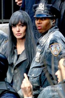· Angelina Jolie was smacked between the eyes on the set of Salt today, drawing blood. Coincidentally, one of Jennifer Aniston's Louboutins was found amidst the sandbags.