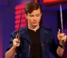 Chris Colfer, who plays America's favorite gay teen Kurt Hummel on Glee, stopped by UK chat show Jonathan Ross last night with fellow castmates Amber Riley and Matthew Morrison. Amber busted out a little Michael Jackson and Mr. Schuester talked about his waiter days, but Chris decided to take this opportunity to come out of the closet...the "bad-ass with swords" closet. Whirling around his sais, he looked impressively deadly until you realize that what are swords really but pointy batons? And I think we'd all expect baton-twirling to be in any good glee clubber's wheelhouse. Video evidence after the jump.