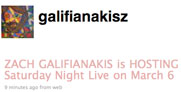 Zach Galifianakis' Twitter feed just announced the Hangover star will be hosting the March 6 episode of Saturday Night Live, promising at least one sketch in which Andy Samberg will hang suspended from Zach's belly in an AdultBjörn. Hooray! (Hopefully he'll write his own sketches.) [@galifianakisz]