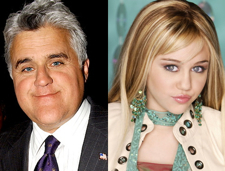 · Miley Cyrus and Jay Leno have more in common than you might think: Both are television personalities desperately trying to expand their audience -- Cyrus has said that she wants to target the "16-year-olds and the 26-year olds" instead of her six-year old fan base while Leno wants to boost his Tonight Show ratings, which dipped to a 17-year low last quarter -- and both will share the small screen during the final season of Hanna Montana when the comedian stops by as a special guest-star. Other exciting guests this season include Sheryl Crow, Ray Liotta, Christine Taylor, Dr. Phil McGraw, Kelly Ripa and a horse. THR]