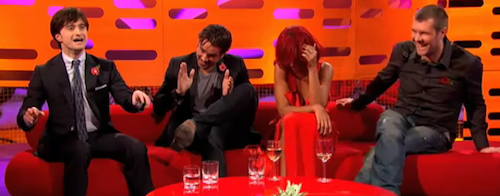 Daniel Radcliffe: multimillionaire at age 21, Broadway's newest star, staunch supporter of gay rights and, oh yeah, an ENORMOUS nerd. On Graham Norton's show, Radcliffe decided to wow the audience and show his scientific acumen by singing The Elements, a song that lists every single element on the periodic table. It's sort of adorable how very into it Daniel is (plus he's pretty clearly very nervous as fellow guests Rihanna and Colin Farrell look on with judgey eyes). But just to burnish his bad-boy bonafides, Radcliffe said he's also looking forward to getting some tattoos now that Harry Potter is over. I don't know about you, but my knees go weak for a fella with a giant screaming eagle emblazoned on his chest who could also tell me all about tungsten. Watch the song after the break!
