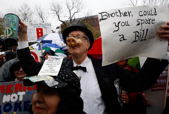 WASHINGTON - APRIL 15: Protesters take part in a rally as part of the national Tax Day Tea Party to protest taxes and government spending in Lafayette Park April 15, 2009 in Washington, DC. April 15th marks the day American citizens must file their annual income taxes with the federal government. (Photo by Win McNamee/ Getty Images)